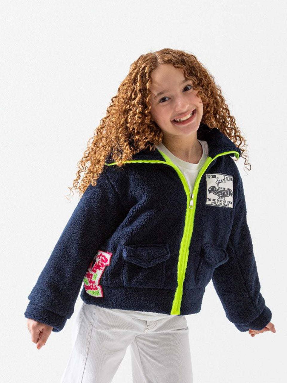Shine with confidence in this navy blue glossy girls’ jacket, designed with “LOVE” zipper detail...