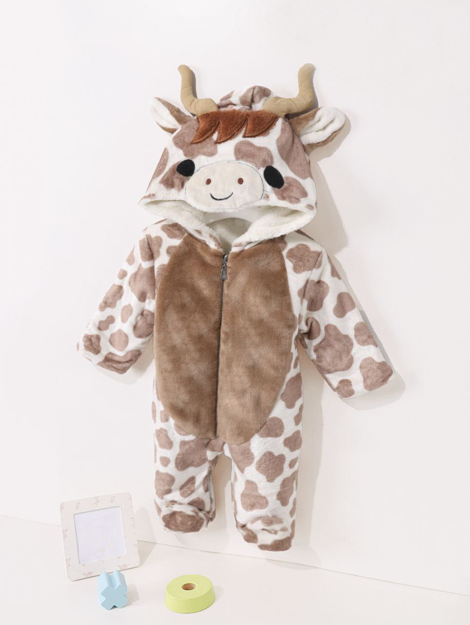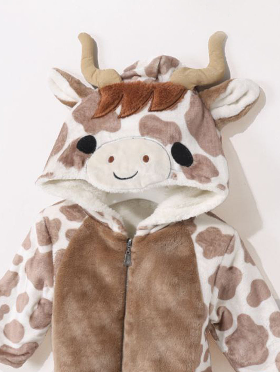 تتميز البدلة بغطاء رأس مزين بوجه بقرة لطيف مع قرون وأذنين بارزة ثلاثية الأبعاد وتفاصيل مطرزة تمنحها جاذبية لا تقاوم. النقشة المنقطة باللونين البني والأبيض مع تصميم كامل من الفليس الدافئ توفر دفئًا ناعمًا، بينما يسهّل السحاب الأمامي عملية اللبس وتغيير الحفاض بسرعة وسهولة.