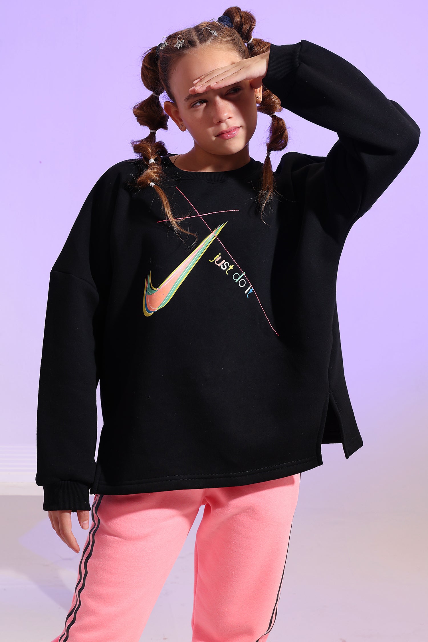 The set includes a relaxed-fit sweatshirt with a modern graphic print and matching jogger pants featuring side stripe details for a sporty look.