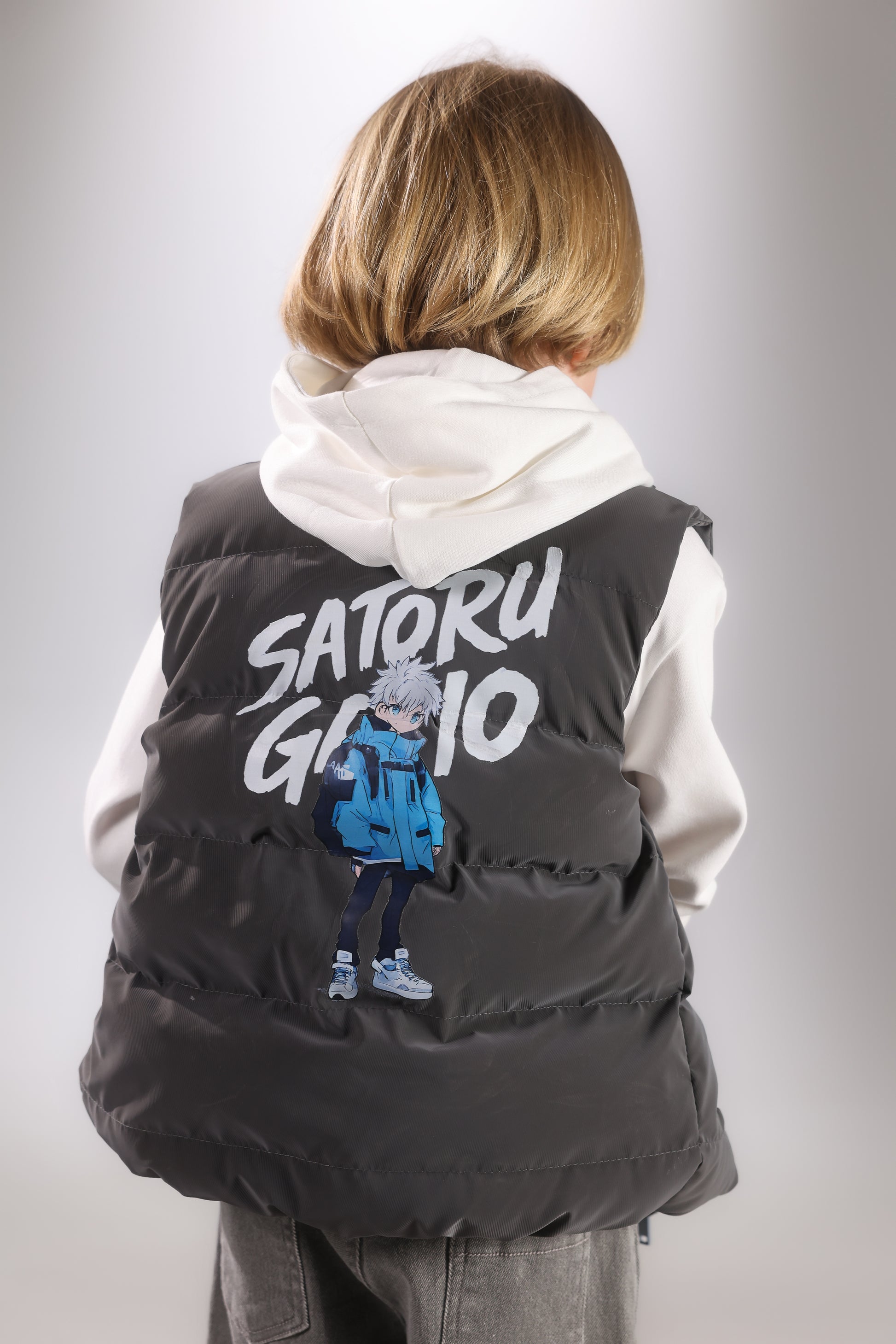 This set includes a grey padded puffer vest for added warmth, a soft hoodie with modern print details, and relaxed-fit cargo pants for a sporty everyday look.
