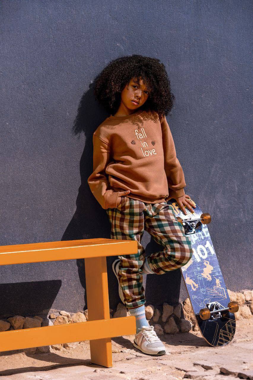 The brown sweatshirt features the sweet phrase “Fall in Love” with embroidered heart details, bringing a warm seasonal touch to the look. Paired with relaxed-fit plaid pants in earthy green, brown, and beige checks, the outfit creates a trendy balance of style and comfort. The elastic waistband ensures a secure yet comfortable fit, while the soft fabric allows freedom of movement for active kids.
