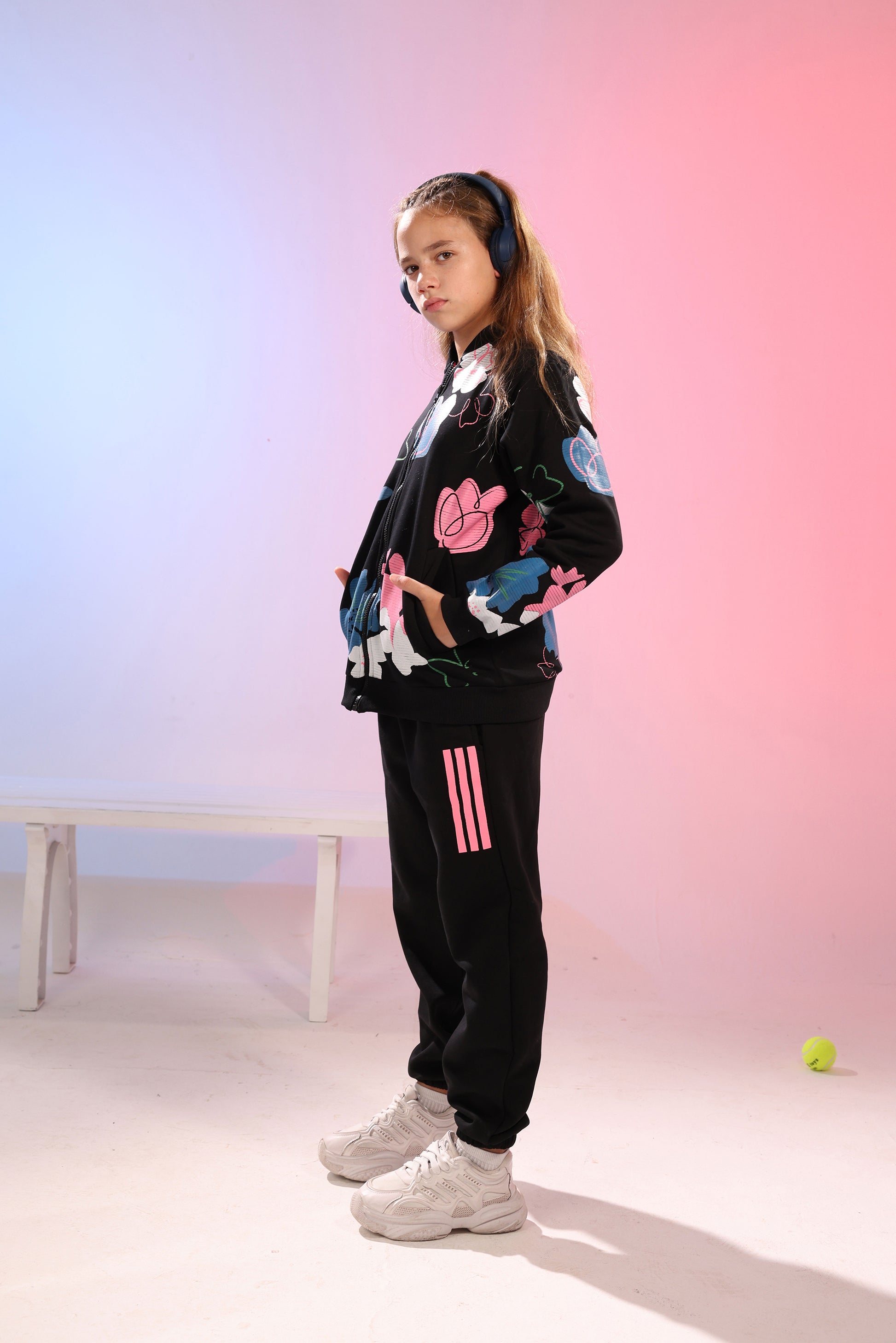 This black sports outfit features a vibrant floral print that adds a playful yet stylish touch to an everyday look.