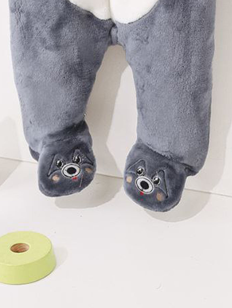 The romper features a cute raccoon face on the hood with embroidered details and 3D ears, making it extra charming. The grey-and-white fleece design adds a playful touch, while the matching raccoon faces on the feet complete the look. With a full-body fleece construction for warmth and a front zipper closure, it’s practical and easy for quick dressing and diaper changes.